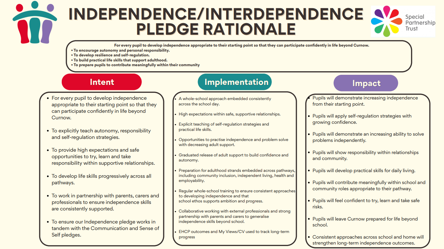 Independence/interdependence - We pledge to ensure that every Curnow student leaves school having developed the will and the skill to be as independent as possible. They should know that it is ok to ask for help, know who they can ask and be allowed to make mistakes so that they can learn. They should be enabled to practice autonomy and choice throughout every school day.