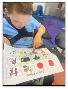 In Crofty class we are working on our pre-reading skills. We really enjoy music, stories, songs and rhymes and these are incorporated in our sensory phonics learning. We are learning to recognise environmental sounds, enjoy rhythm and identifying difference in sounds, for example focussing on fast and slow rhythms, or listening to loud and quiet sounds and attempting to replicate these with our bodies or voices. All of this comes into Letters and Sounds Phase 1 phonics, and all of the skills we are practicing will support us to learn to ‘read’ our environment. For all children this is the first building block in their reading journey. Additionally we are taught how to interpret photographs, 3D tactile and visual symbols and signs, another component in early reading development. In Crofty Class reading and communication are closely linked and often cross over.